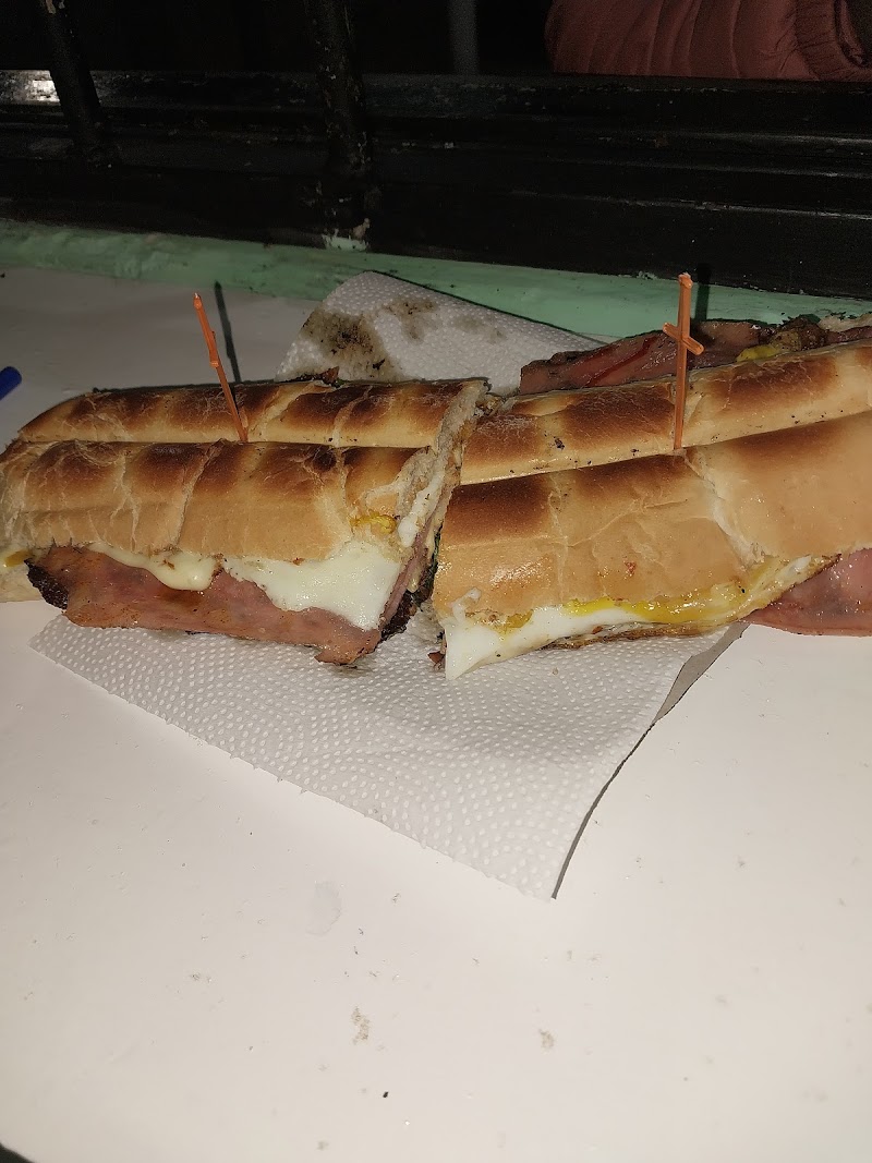 Ingredientes: Pan de pachata, lomo de ternera, jamón, queso, tomate y lechuga, un dip de mayo y de picante, aprox 30cm + papas fritas